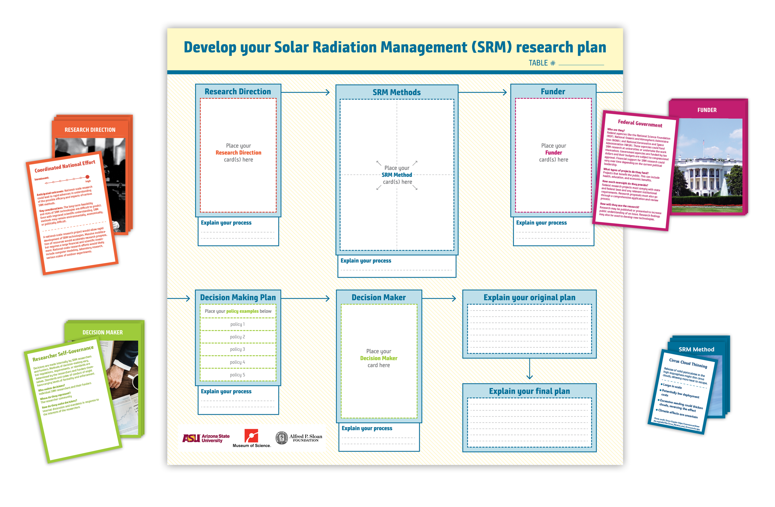 We designed the materials to be intuitive to use so that the participants could focus their mental energy on the issues surrounding solar radiation management. For example, the cards are color-coded by type, and the boards are designed with arrows and “place your card here” instructions so that the tasks are clear. Each piece has organized information, clear instructions, and room to write where necessary.