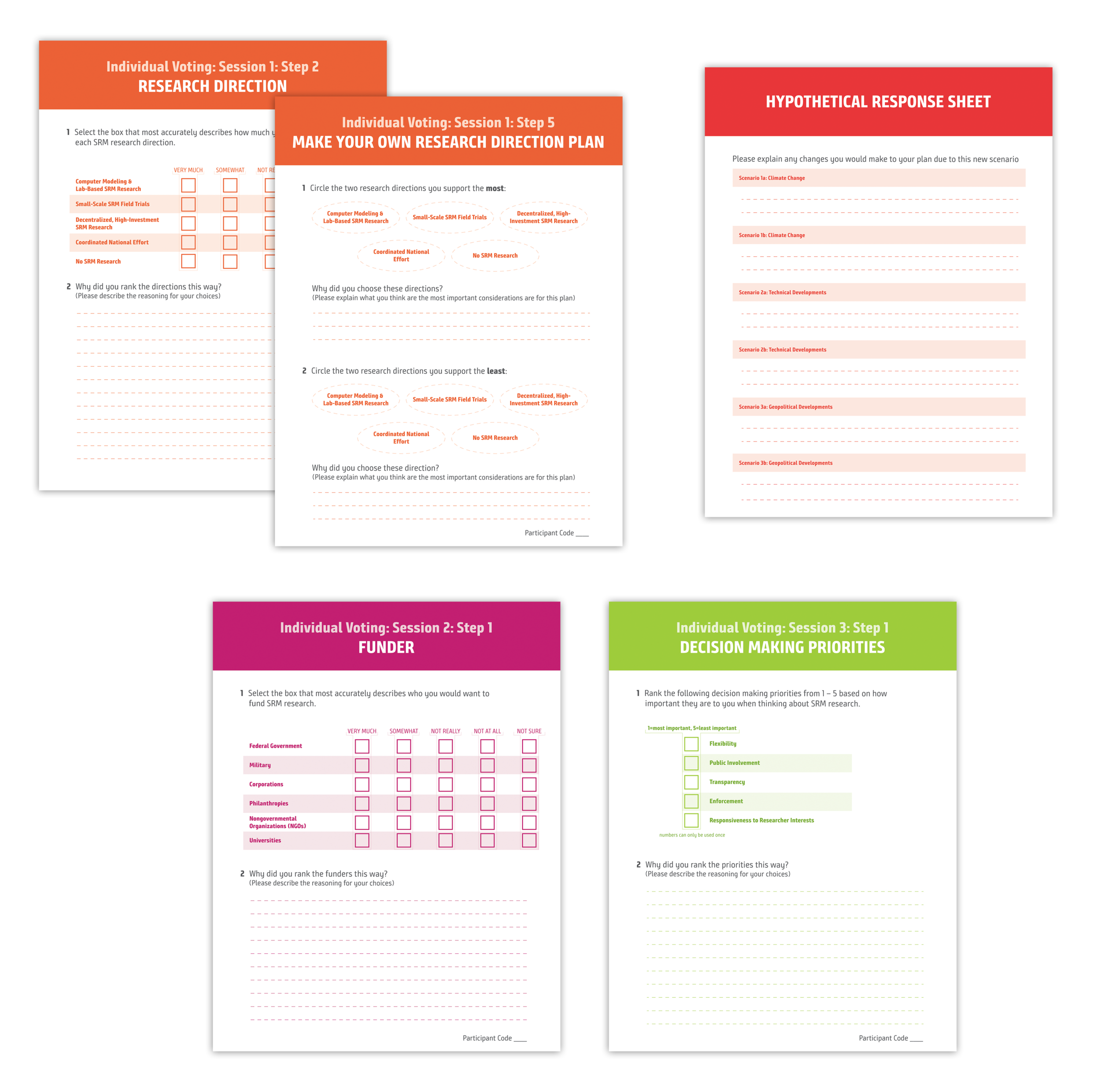 We created printed materials for a series of in-person discussion groups on the topic of solar radiation management. Function was the primary design consideration for this project, we needed to ensure that the materials would support a productive and efficient discussion.