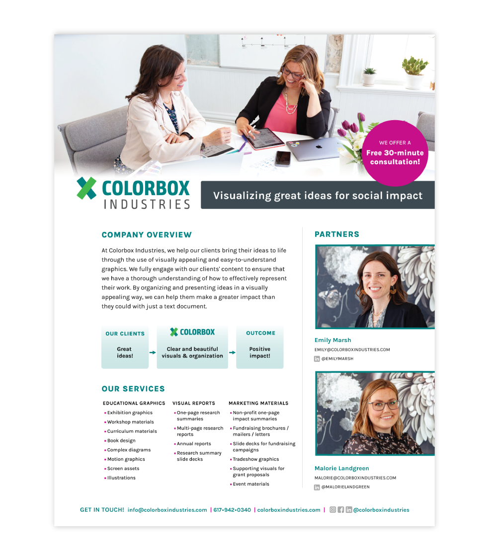 This 2 page info-sheet describes everything you need to know about Colorbox Industries: the services we offer, our unique design process and a brief description about us!